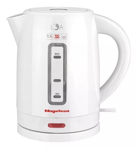 Hervidor eléctrico Magefesa. Filtro de agua permanente. Luz indicadora encendido/apagado. Sistemas de seguridad: Control y apagado automático después de ebullición. Desconexión al separar la jarra de la base.